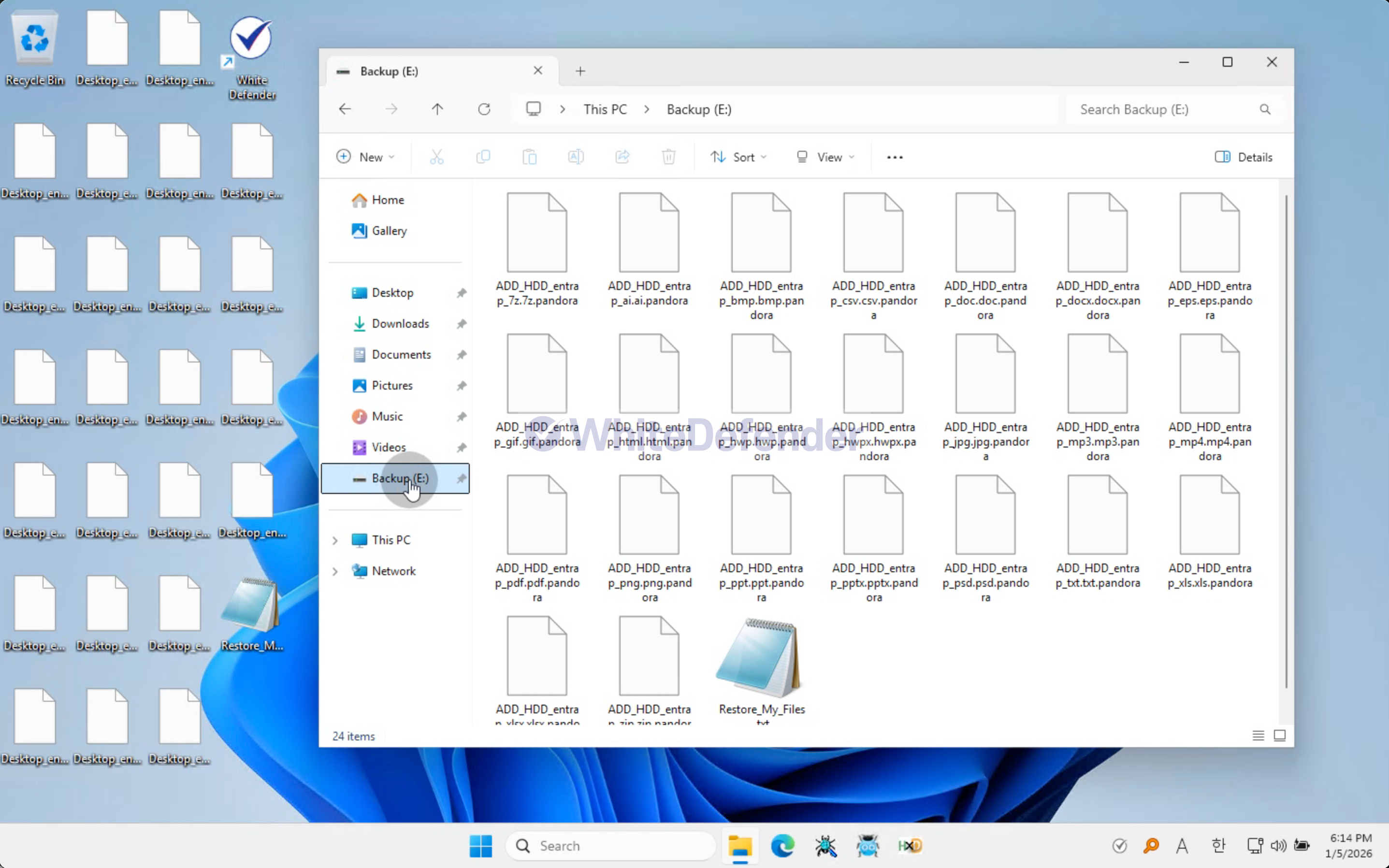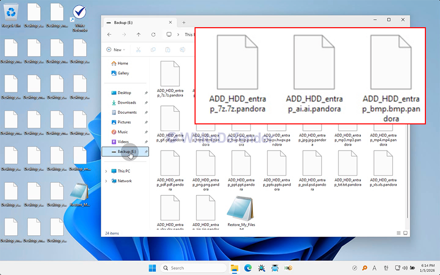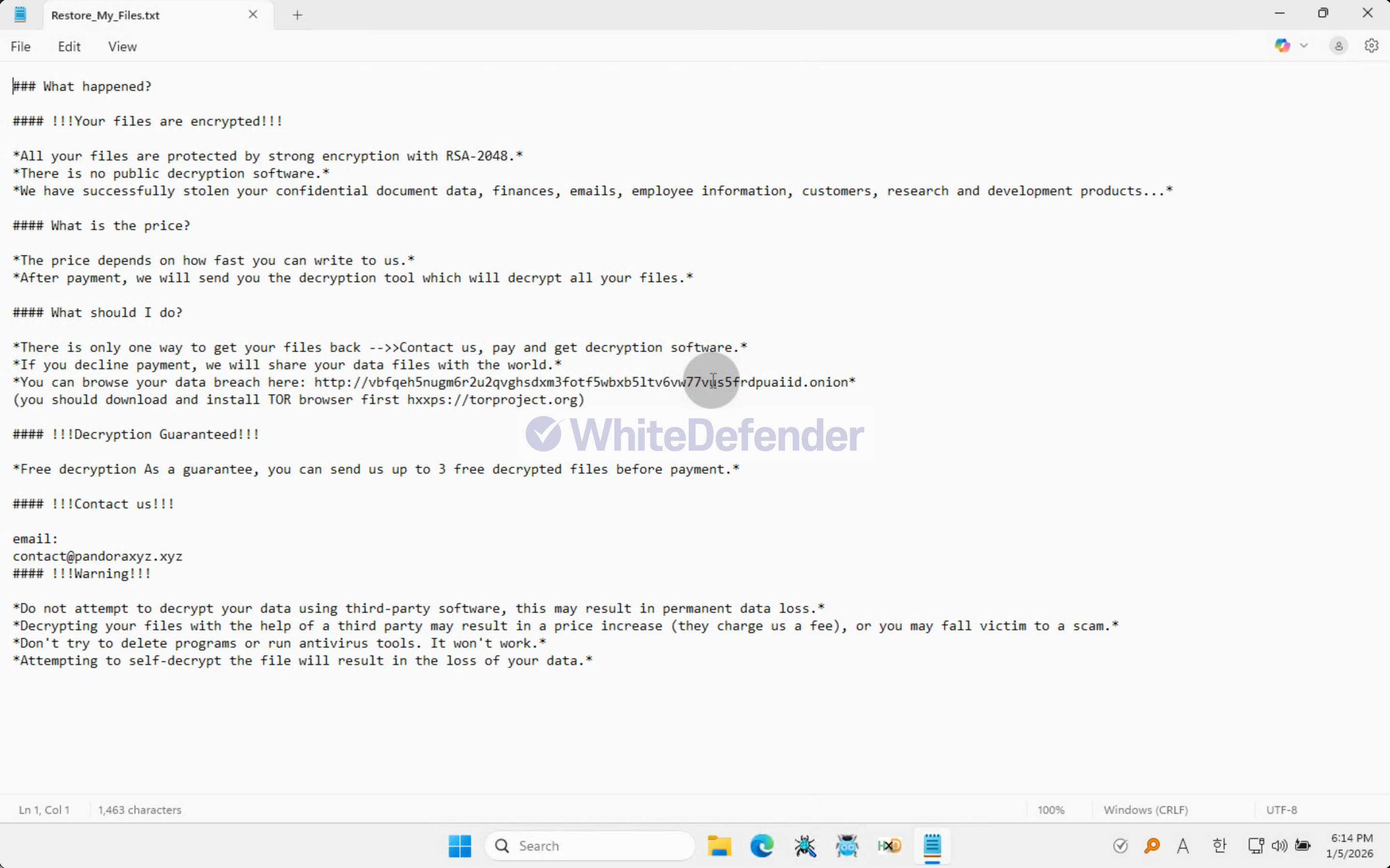 Pandora 랜섬웨어는 Windows 시스템에서 실행되며, 로컬 파일을 암호화한 뒤 .pandora 확장자를 추가합니다. 감염이 진행되면 사용자의 모든 파일 데이터 영역에 Restore_My_Files.txt 랜섬노트를 생성하고, 확장자가 모두 암호화되어 사용자가 감염 사실을 즉시 인지하도록 유도합니다.