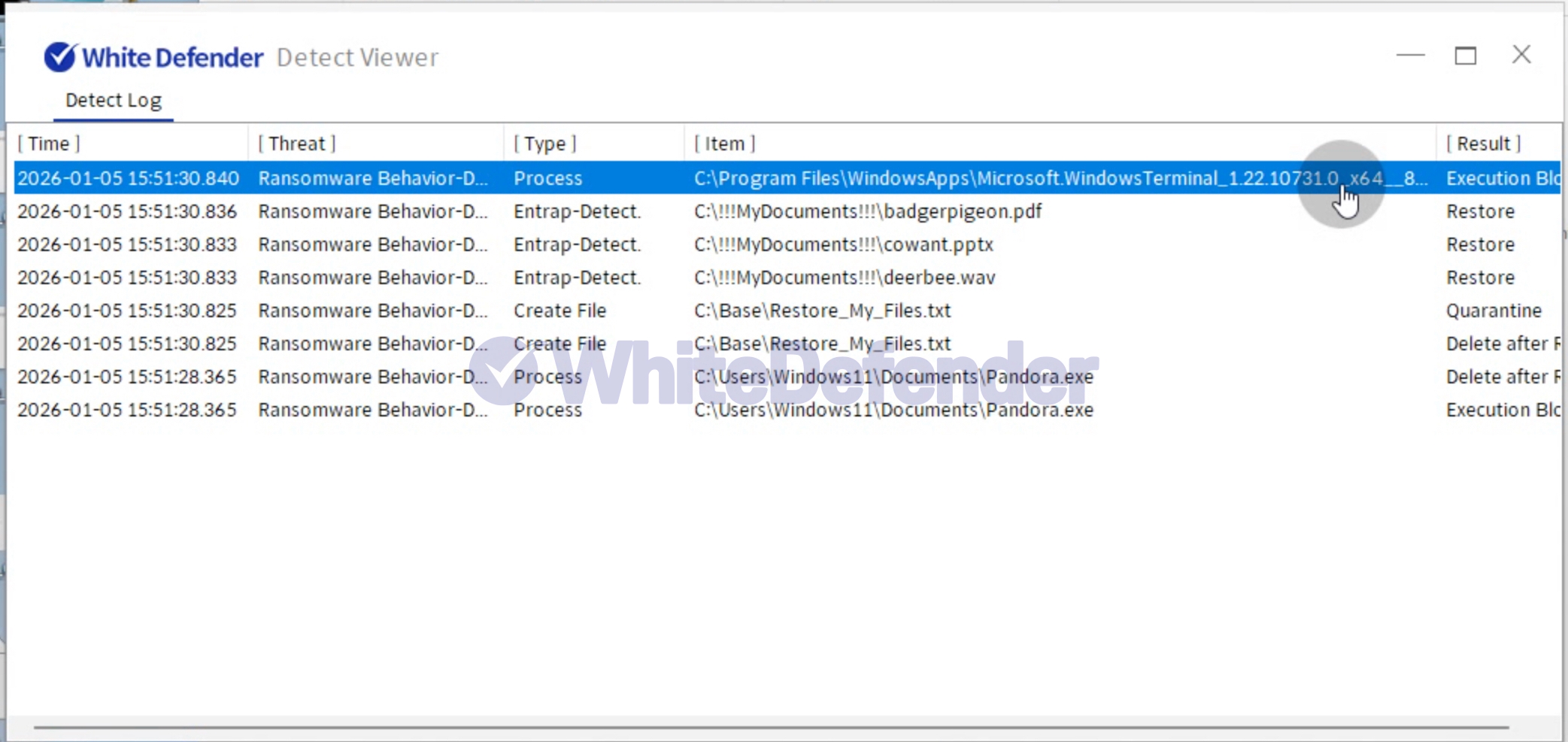 그림 4. WhiteDefender Detect Viewer 탐지 로그: Ransomware Behavior‑Detect 탐지 및 Execution Block / Quarantine / Restore 기록