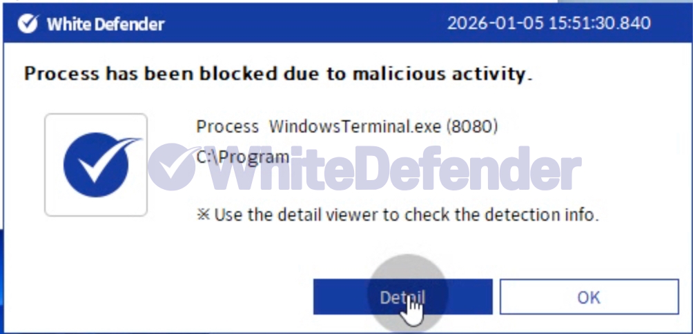 그림 5. WhiteDefender 차단 알림 팝업: Process has been blocked due to malicious activity