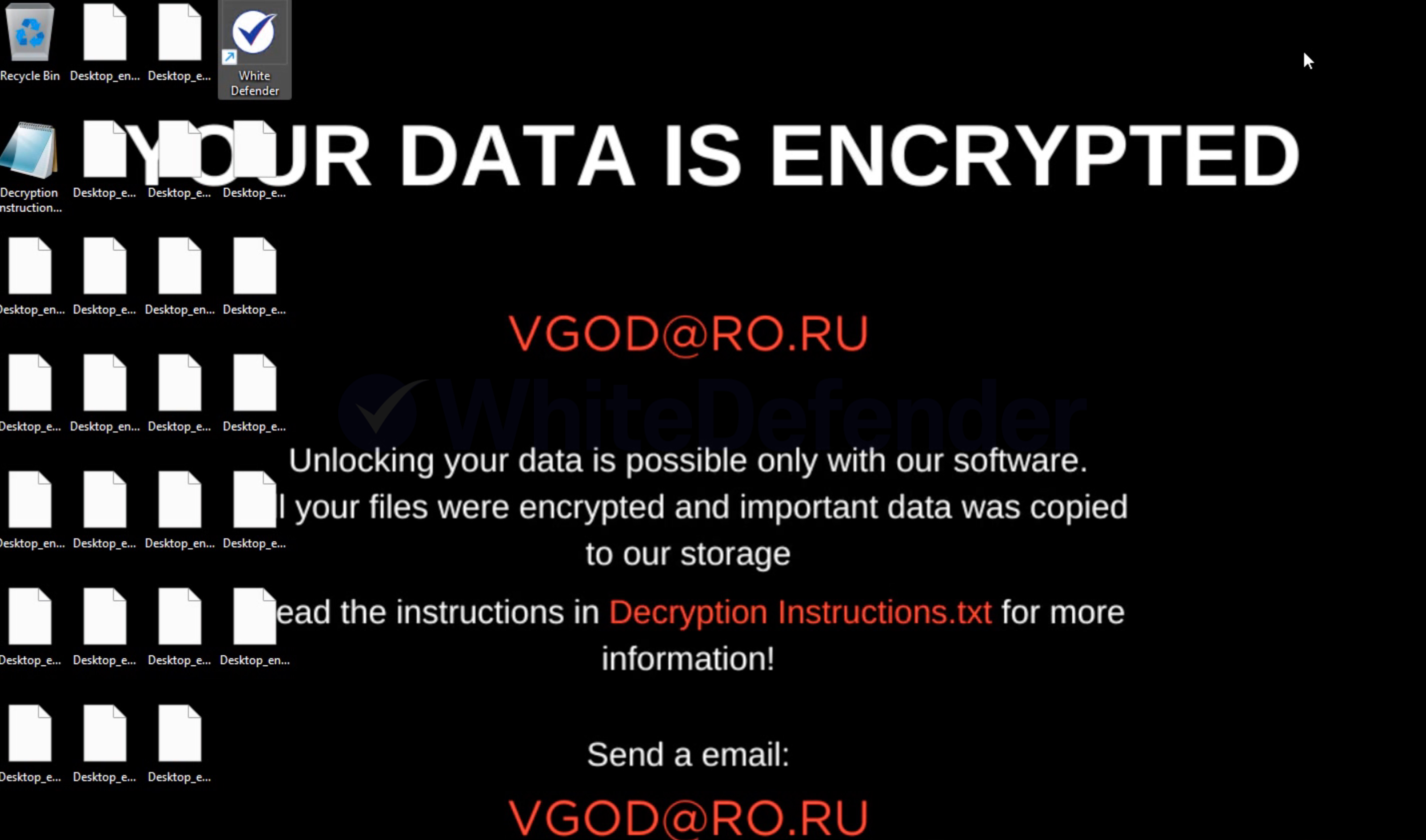 Vgod(브이갓) 랜섬웨어는 Windows 시스템에서 실행되며, 파일을 암호화한 뒤 [파일명.확장자.Vgod] 형태로 확장자를 추가합니다. 암호화 진행 후에는 Decryption Instructions.txt 랜섬노트를 생성하고, 바탕화면도 "YOUR DATA IS ENCRYPTED" 메시지로 변경해 랜섬웨어 감염 피해 사실을 사용자에게 알립니다.