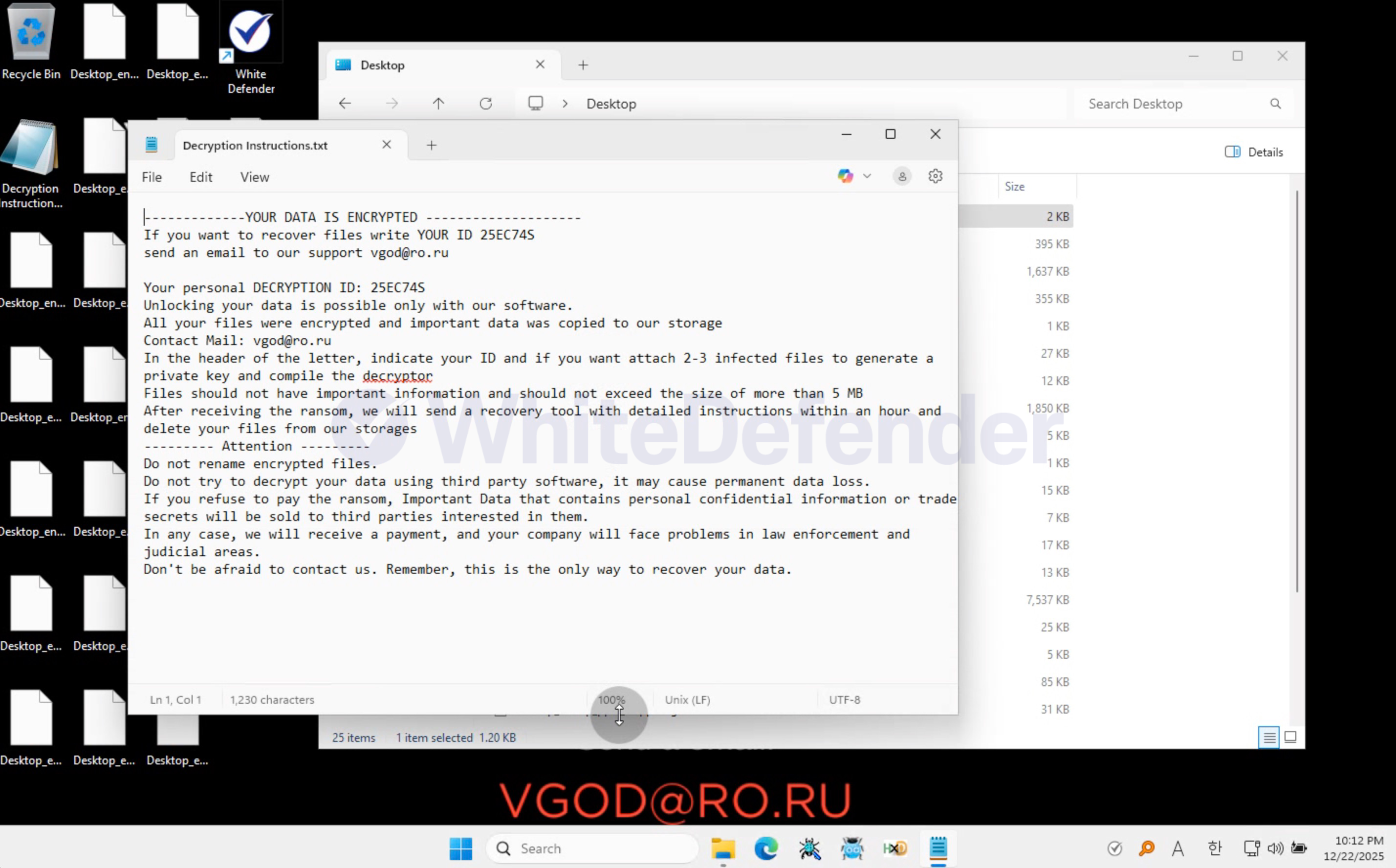 • 랜섬노트에서 이메일(vgod@ro.ru)로 연락 요구 및 협박성 문구 확인 가능