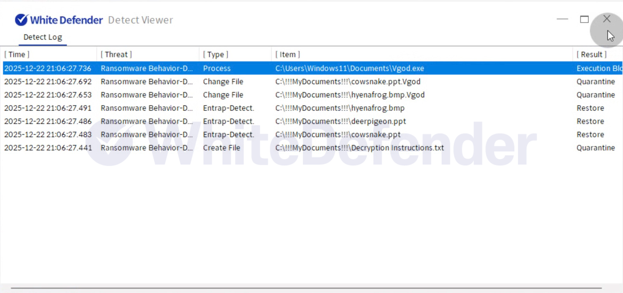 그림 4. WhiteDefender Detect Viewer 탐지 로그: Ransomware Behavior‑Detect 탐지 및 Execution Block / Quarantine / Restore 기록