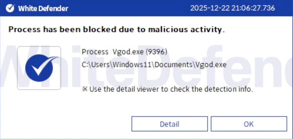 그림 5. WhiteDefender 차단 알림 팝업: Process has been blocked due to malicious activity (Vgod.exe)